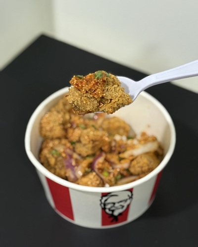地元の人たちに人気のある「Spicy Chicken Rice Bowl/スパイシーチキンライスボウル」は、ご飯の上に辛い味付けのフライドチキン、パクチー、タマネギ、ハーブなどが乗ったメニューです。