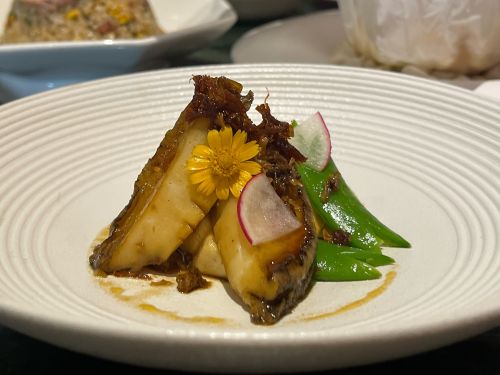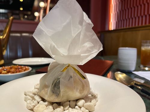 アツアツのお皿の上に紙で包まれているのは、新鮮なシーフード。「龍虎斑」は台湾の南部で養殖されている白身魚です。