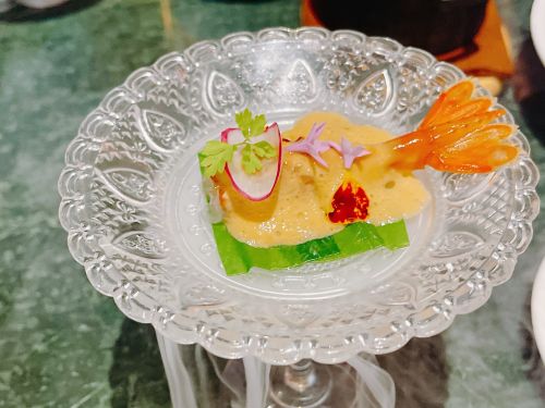 希少なエビにゴマ油ペーストのソースを添えた冷製。究極に冷やされたグラスからでる煙と、鮮やかな食の色彩がエンターテイメントしても成立しています!