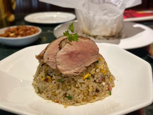 ソーセージとラー油でパラパラと炒めた香ばしい炒飯。大きくスライスされたダックがのった豪華な一皿です。