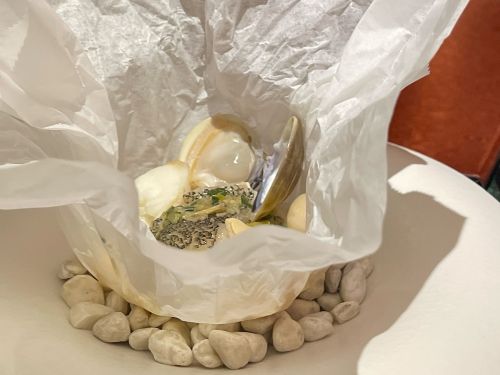 ハマグリと白身魚の紙包み焼(紙包蛤蜊龍虎斑)