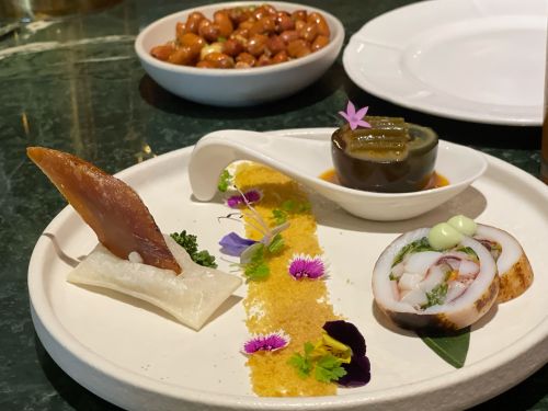 台湾を代表する珍味「カラスミ」と伝統的な餅(皿の左)、ピータンのラージャオ添え(上)、イカの中に鮮やかな具を詰めたもの(右)。