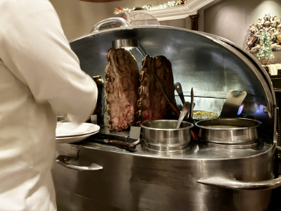 さらに、テーブルの前でボウルを回しながらサラダを和えてくれたり、シェフがワゴンから豪快に肉をカットしてくれるパフォーマンスも名物。 ライブ感のあるサービスは、とても印象的。