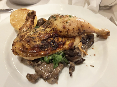 外側をパリっとグリルされたチキンにはニンニク風味のマッシュルームとソテーされたホウレンソウが添えられています。